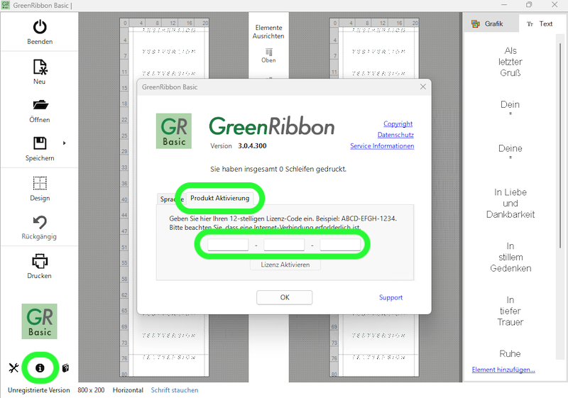 Gestalten Sie eine Schleife mit GreenRibbon und drucken Sie diese auf Ihrem Drucker aus. Abgesehen von einem Wasserzeichen im Ausdruck (TESTVERSION), können Sie alle Funktionen ausführlich testen.